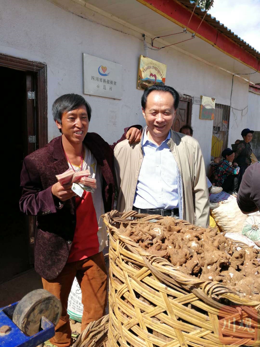 于是,便有了第二張照片。這張照片拍攝于2019年,布拖縣樂安鎮火燈村村民馬查力爾靠在耿福能的肩頭,笑著舉起手中的一沓鈔票。那一年,在中醫藥產業扶貧模式助推下,火燈村一舉摘掉窮帽,曾經的貧困戶馬查力爾靠著種植附子住上新房子,過上好日子。當年9月,耿福能帶隊到火燈村收貨,馬查力爾扛去兩大包附子,換來厚厚一沓鈔票。